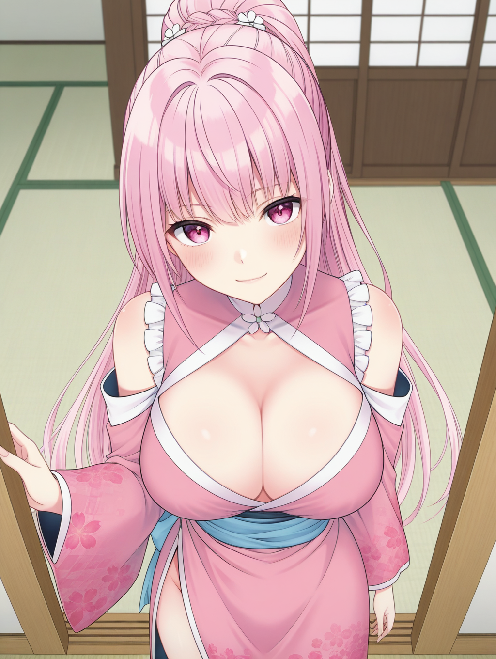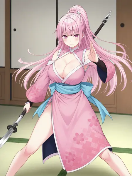 lora:OrikawaSakura-ILXL-v1:1,OrikawaSakura,pink_hair,pink_eyes,ponytail,high_collar,high_slit,side_slit,detached_sleeves,kimono_sleeves,pink_off_shoulder_kimono,blue_obi,flower_pattern,thigh_high_slit,