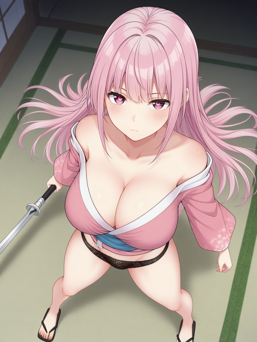 lora:OrikawaSakura-ILXL-v1:1,OrikawaSakura,pink_hair,pink_eyes,straight hair,pink_off_shoulder_kimono,blue_obi,black_lace_panties,partially_removed_clothes,