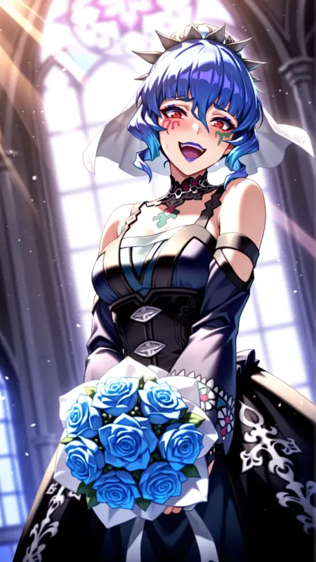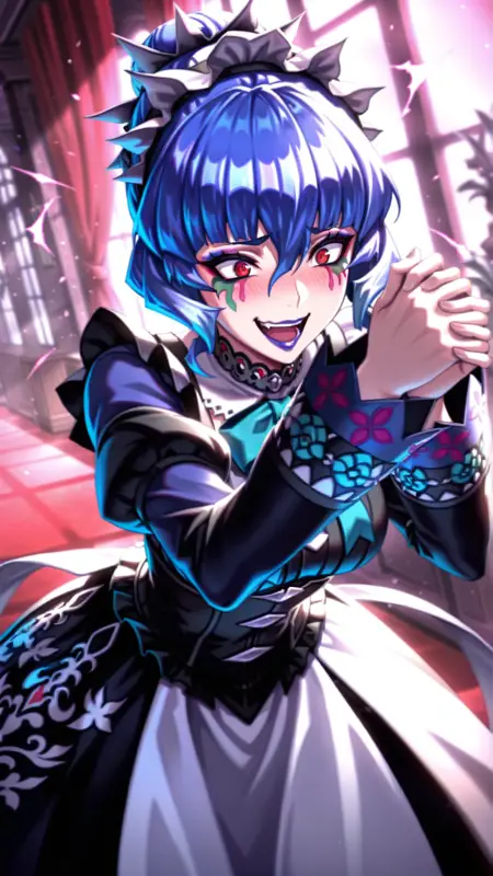 Appearance:blue hair, purple lips, makeup, facepaint ,asymmetrical_mark, red eyes, hair bun,short hair, eyeshadow, hair between eyes, blue lips,