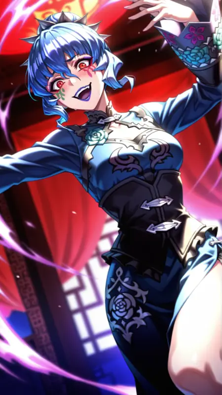 外見: 青髪、紫の唇、化粧、顔のペイント、非対称マーク、赤い目、髪の結び目、短い髪、アイシャドウ、目の間の髪、青い唇、