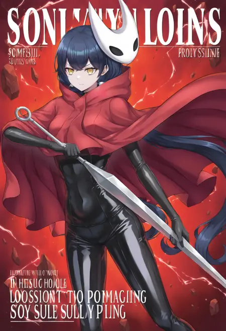黄蜂提示(不要添加其他风格提示): FULM_1,1other,斗篷,红色斗篷,角,无人类,披风,有色皮肤,面具,无嘴巴,红色披风,手持,武器,手持武器