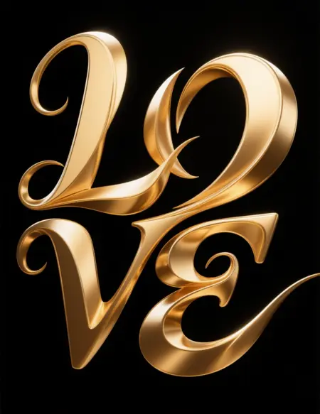 フォントロゴ「LOVE」、ゴールデンの文字、創造的なフォントデザイン、滑らかなラインと芸術的感覚、三次元的な光と影、テキストの抽象的な変形、独自のリズムとダイナミズムを生み出し、強いビジュアルインパクトを与える。洗練された、黒い背景。