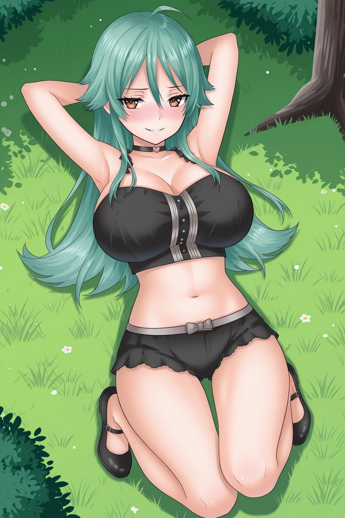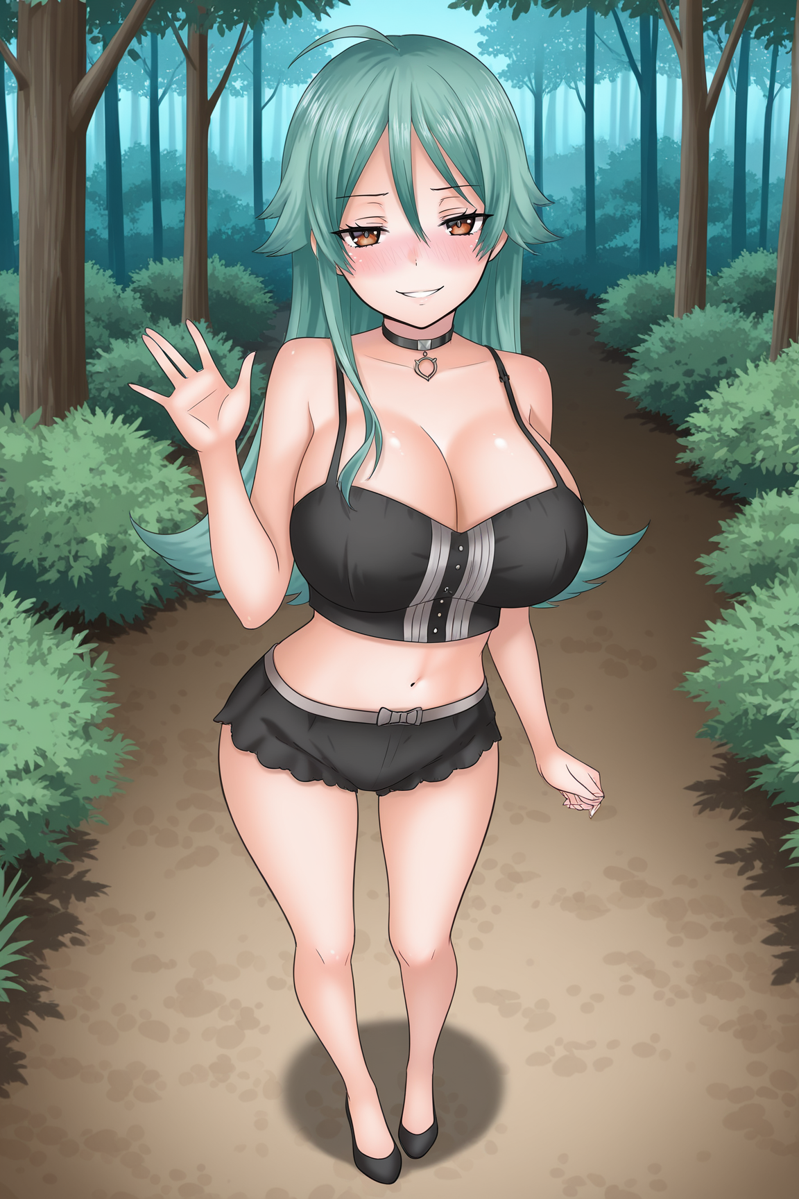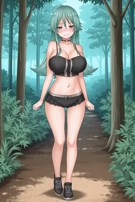 ➜ KyoTTILXL, 棕色眼睛, 绿发, 发丝遮眼, 长发, 大胸, 黑色项圈, 黑色露脐装, 无袖, 黑色短裤, 超短裤, 黑色鞋子