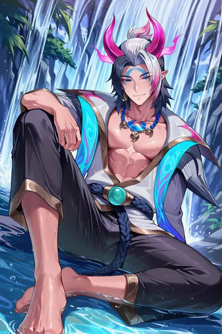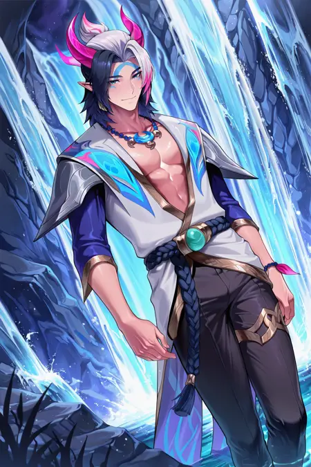 Aphelios, spirit blossom aphelios, 흰 머리, 이색 머리, 검은 머리, 줄무늬 머리, 분홍 머리, 파란 눈, 얼굴 무늬, 뾰족한 귀, 뿔