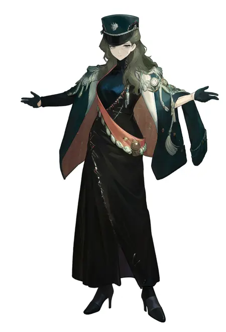 gsn1,1girl,solo,green hair,long hair,grey eyes,scar on face,black top hat,aiguillette,clock,black dress,green coat,scar on arm,black gloves,half gloves,whistle,shoulder sash,black high heels,