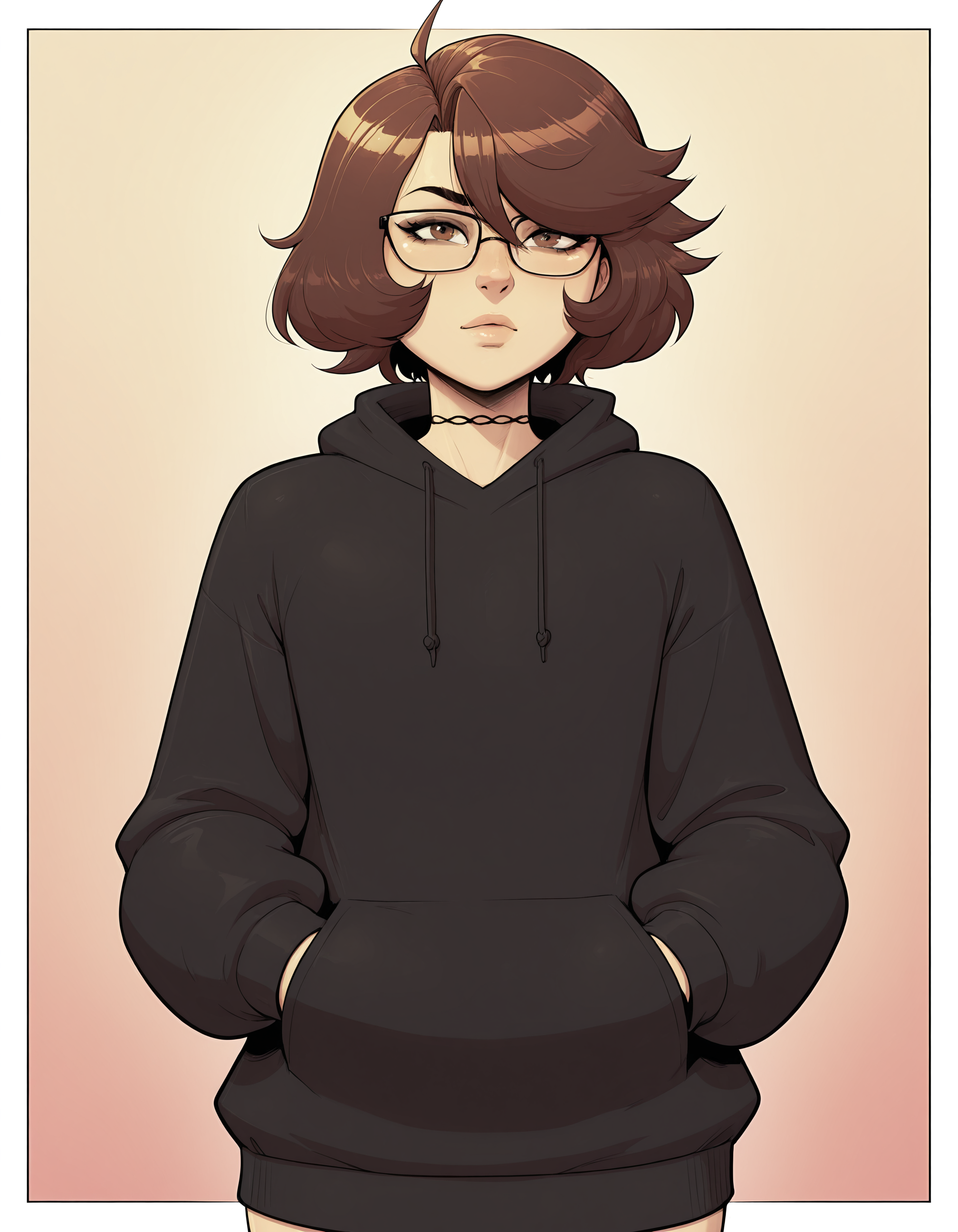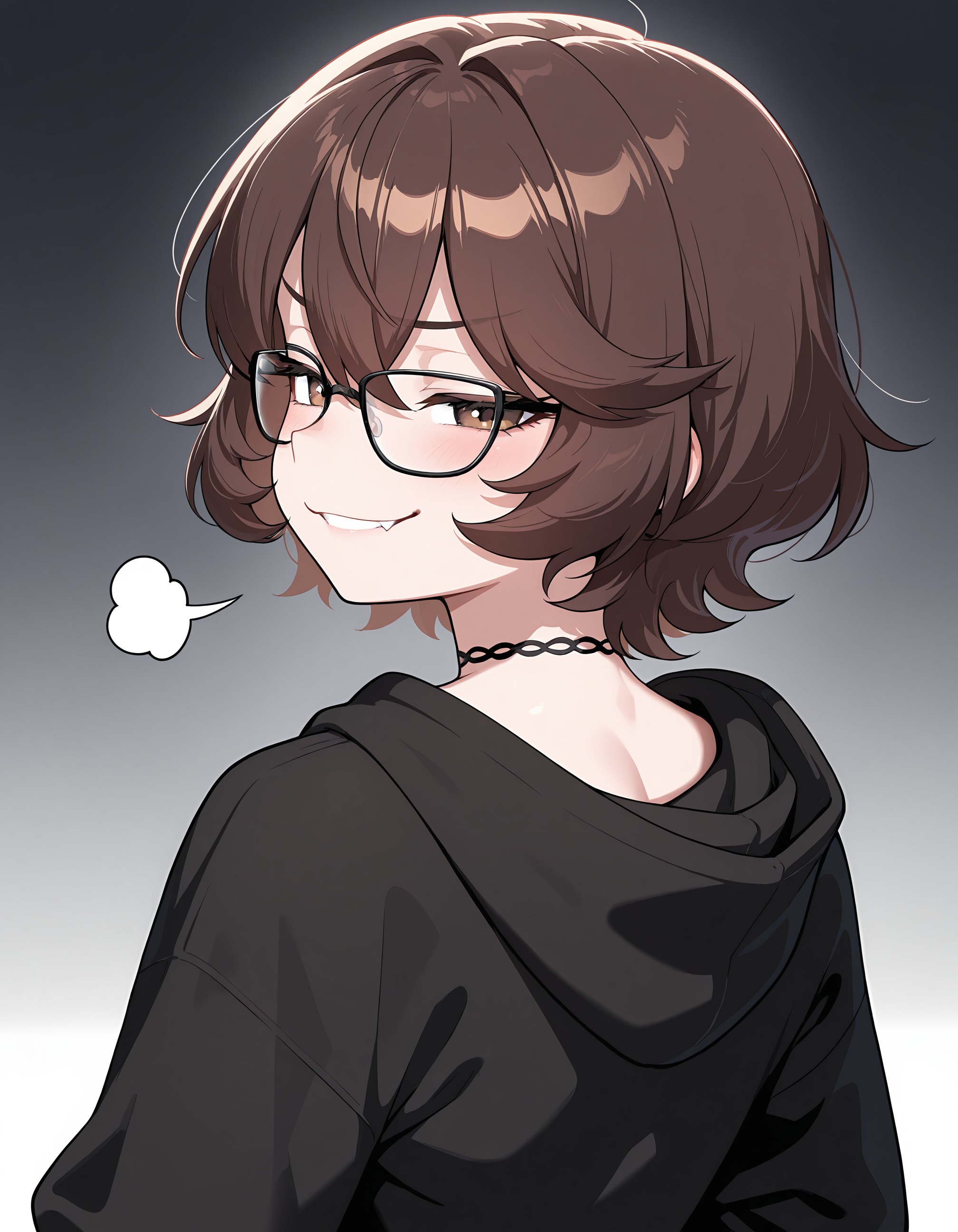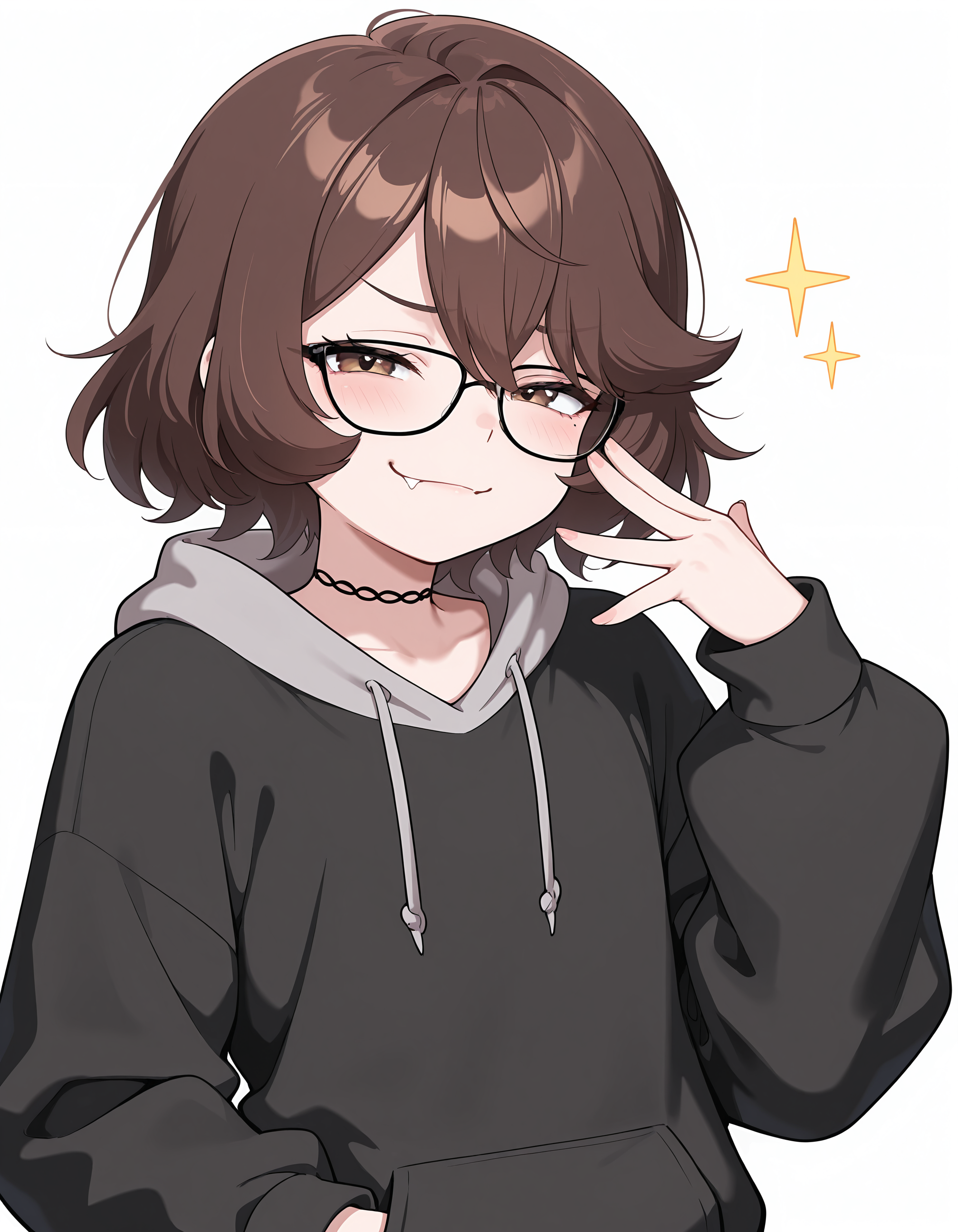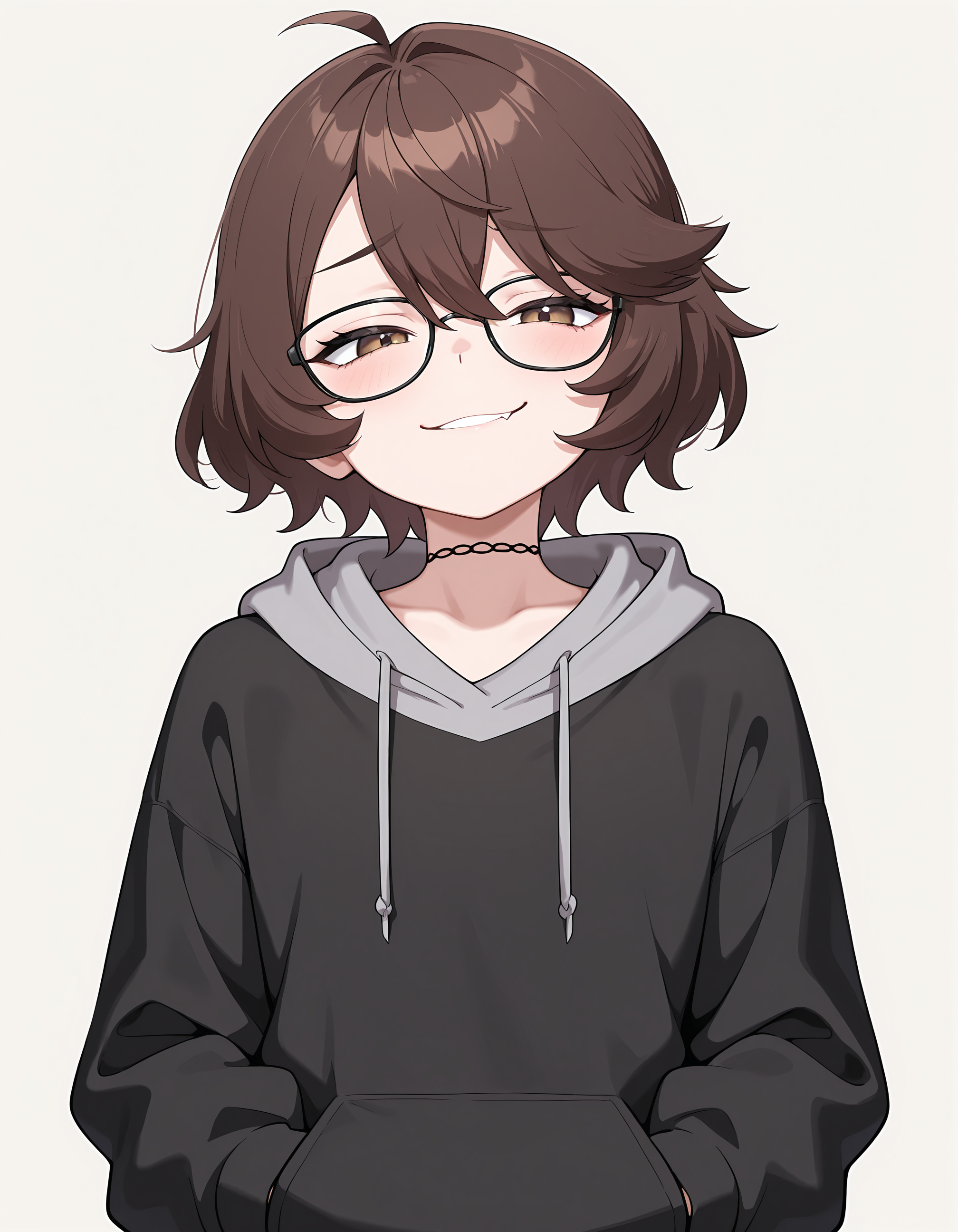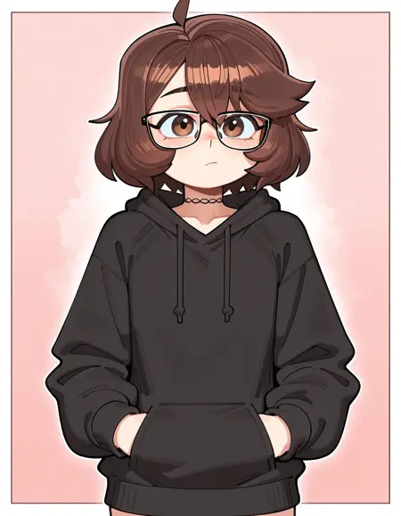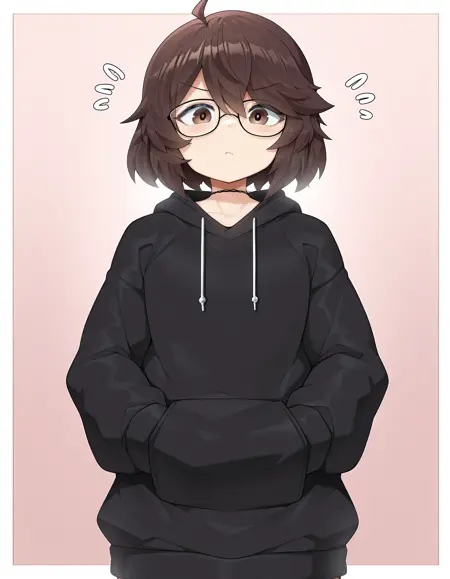 Prompts: otokonoko, trap, d1m1tr1_m0nr0e, 茶色の髪, 短い髪, 茶色の目, メガネ, レースの首輪, ブラックのフーディ, グレーのフード,