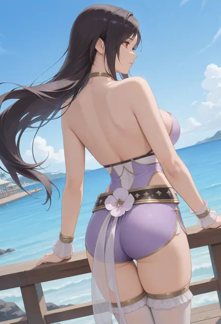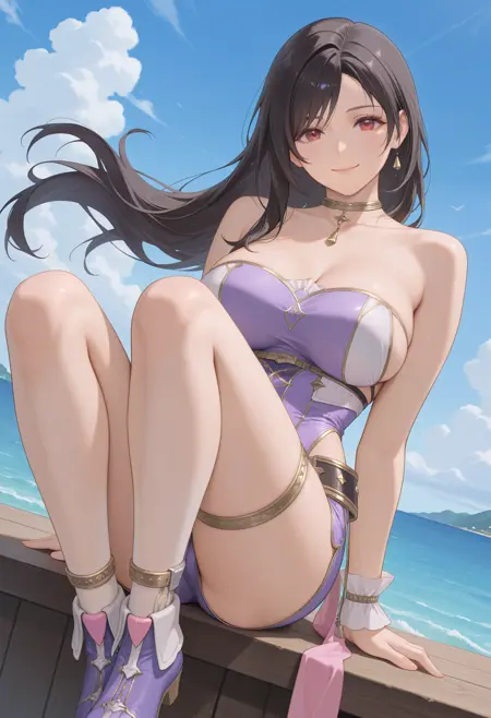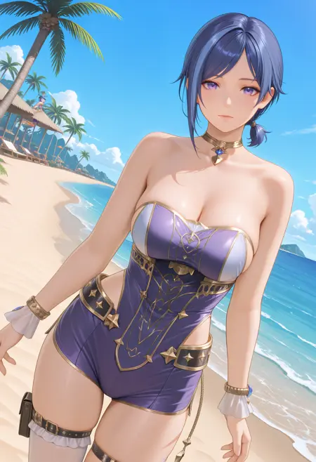 基本プロンプト:"ResnaDoaxvv2,gold choker,purple leotard,gold trim,bracelet,wrist cuffs,purple shorts,white thigh-high socks,thigh strap"