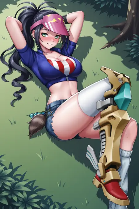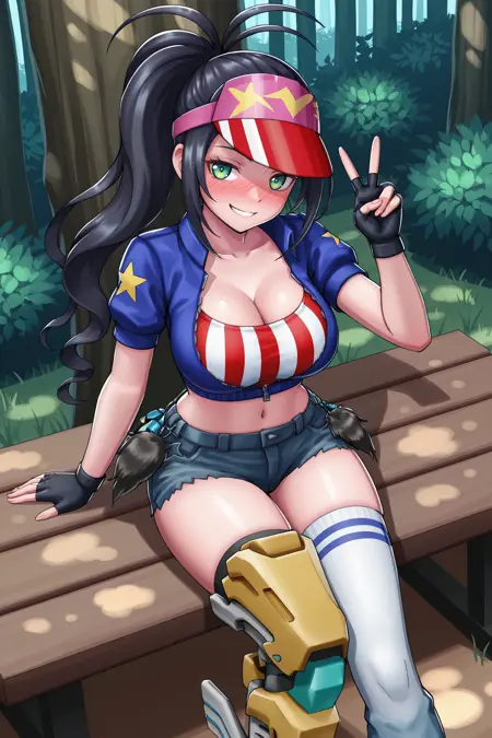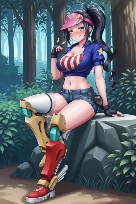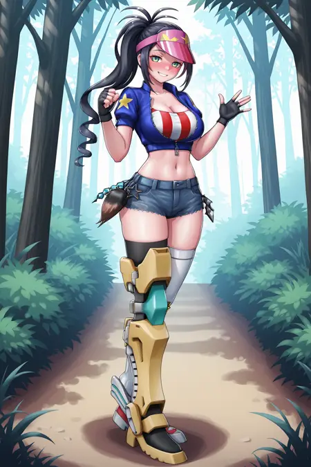 ➜ RitaMSAILXL, 绿色眼睛, 黑色头发, 长发, 马尾, 粉色遮阳帽, 大胸部, 深沟, 蓝色短上衣, 牛仔短裤, 黑色手套, 无指手套, 超短裤, 单右机械腿, 单只白色过膝靴, 红色鞋子