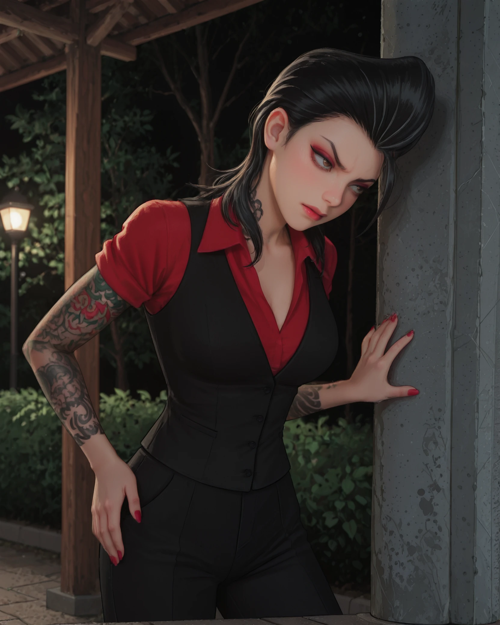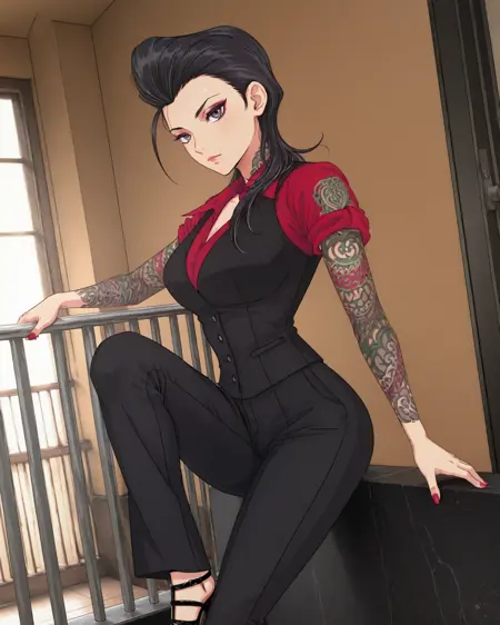 Trigger: S4buk0, 1girl, black hair, hair slicked back, makeup, arm tattoo, nail polish, red nails, shirt, black vest, black pants, high heels