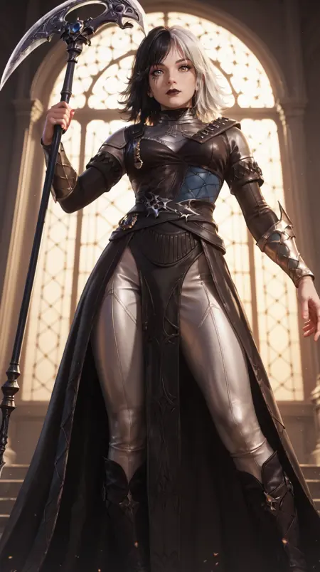 split-color hair, white hair, black hair, heterochromia, black lips, medium hair