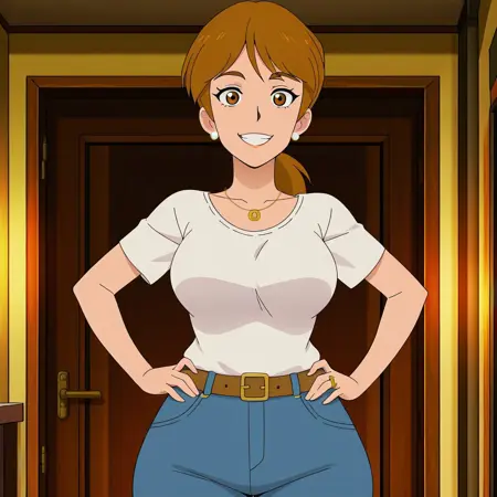 Katherine_Haunted, 갈색 머리, 낮은 포니테일, 갈색 눈, 귀걸이, 보석 귀걸이, 목걸이, 링 목걸이, 블레이저, 노란색 블레이저, 티셔츠, 흰색 티셔츠, 티셔츠 위의 블레이저, 바지, 파란색 바지, 벨트, 갈색 벨트, 금색 버클, 가슴,