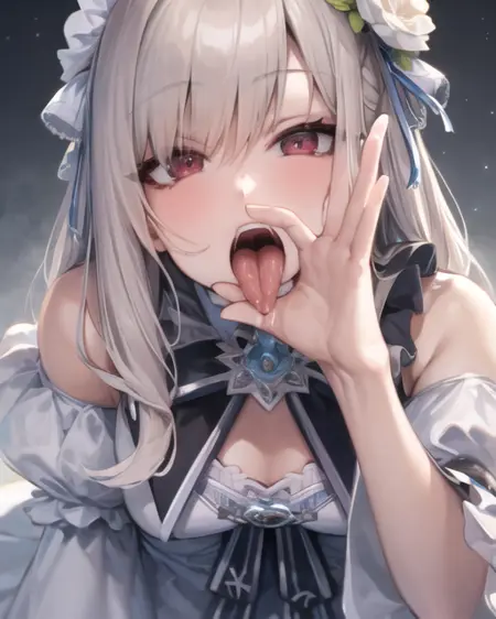 開いた口、舌、一人、観察者を見つめる、片手、舌を出す、フェラチオのジェスチャー、口誘い