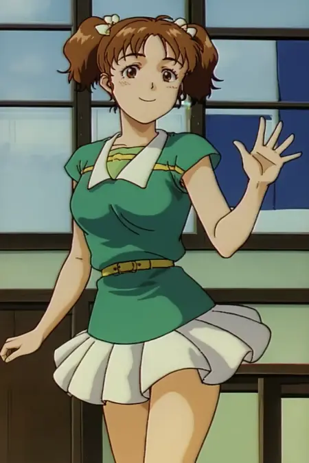 Urotsukidoji2ItouAkemi, white tutu, yellow belt, short sleeved green long shirt with single yellow stripe and white collar, hair bow, official style, breasts,