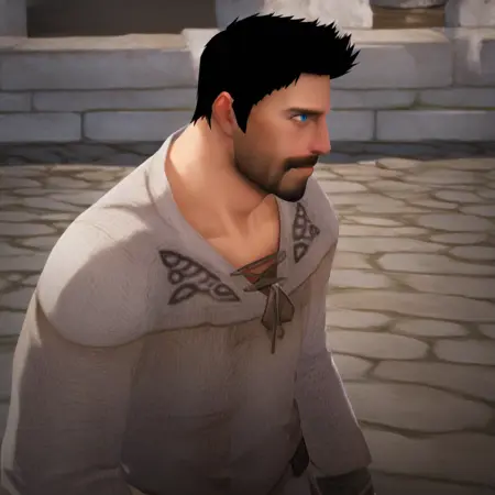 外貌特征:黑色短发,浅蓝色眼睛,面部胡须