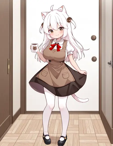 T4mako, 1girl, solo, cat girl, animal ears, cat ears, cat tail, brown eyes, white hair, hair between eyes, very long hair, twin hair, two side up, ahoge, coffee ornament, animal ear fluff,