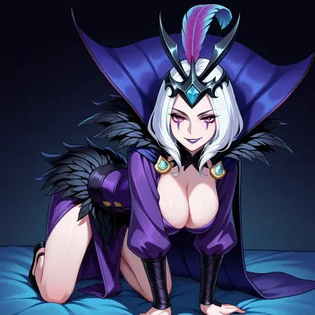 rblbil, 1girl, solo, white hair, large breasts, purple eyes, pale skin, makeup, facial mark, purple lips, purple dress, cape, feathers, feather trim