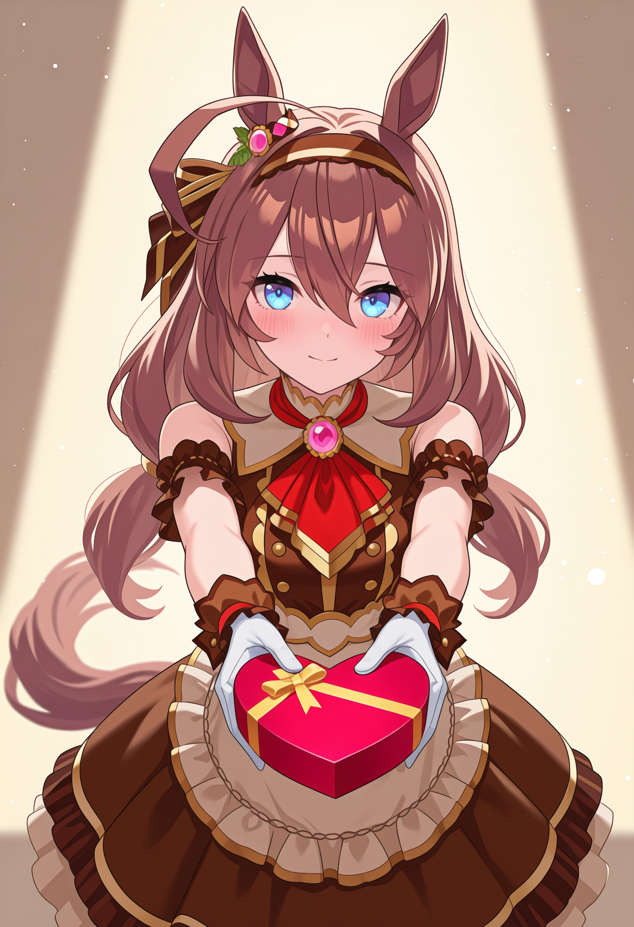 Code:Glassage: mhnbrbndress, 马尾, 长发, 棕发, 天线发, 发丝遮眼, 棕色发带, 动物耳朵, 耳饰, 蓝眼, 花边装饰, 棕色连衣裙, 无袖连衣裙, 红色领结, 胸针, 粉色宝石, 棕色腕带, 白色手套, 腰部围裙, 裸露肩膀