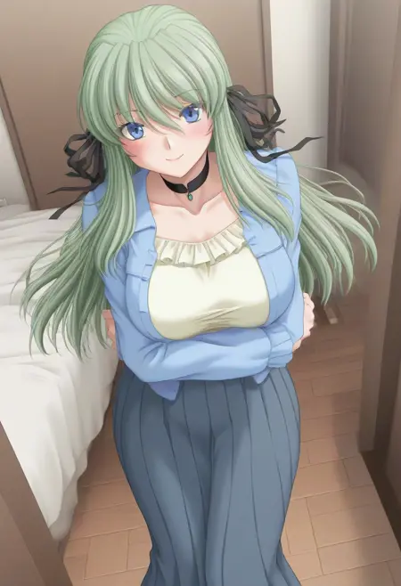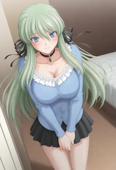 추천 프롬프트: Itsuki Kagashima, 파란 눈, 녹색 머리, 긴 머리, 머리 리본,