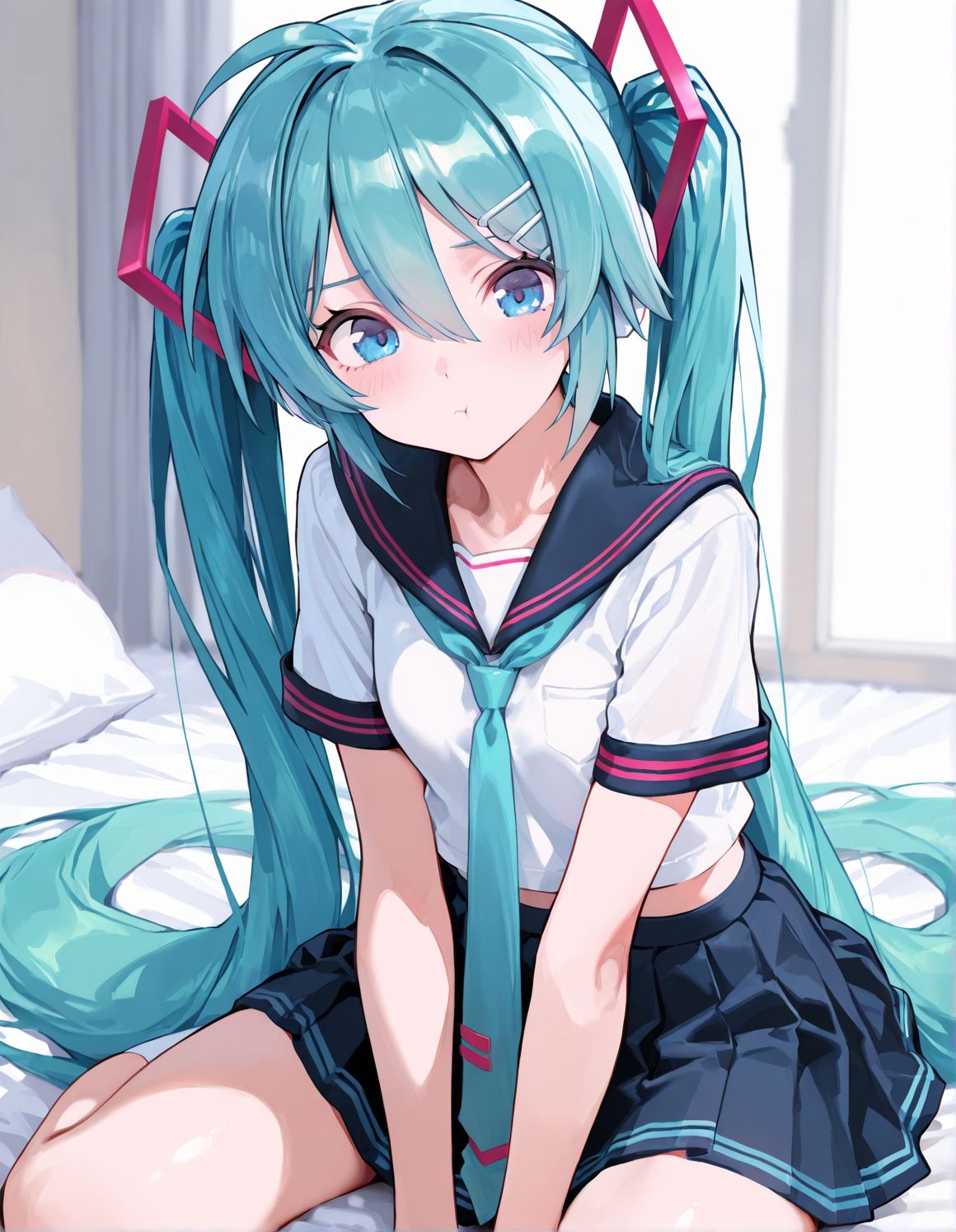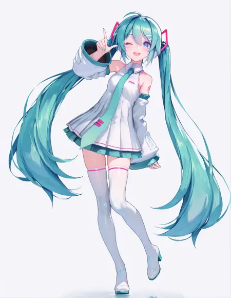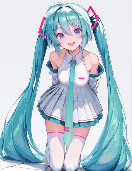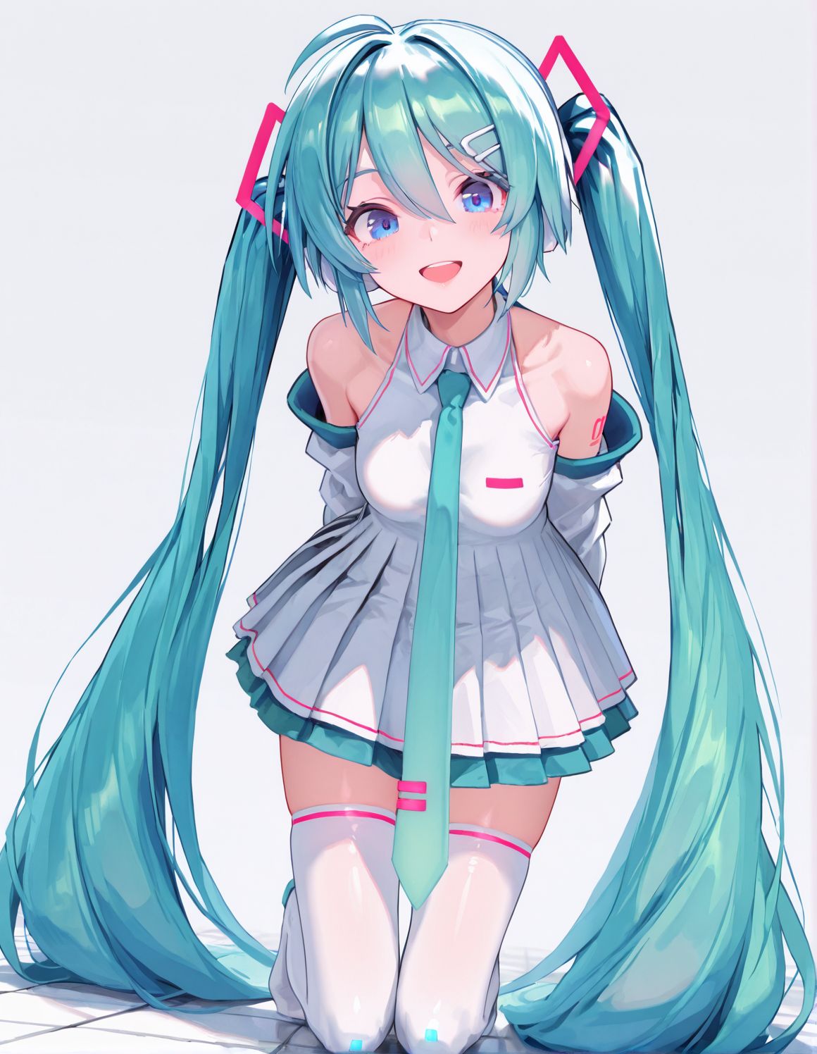 사우르 미쿠, 하츠네 미쿠, 긴 머리, 트윈테일, 청록색 머리, 넥타이, 머리 장식, 어깨 노출, 청록색 넥타이, 민소매, 분리된 소매, 흰 드레스, 허벅지 양말