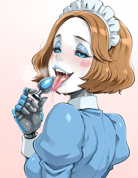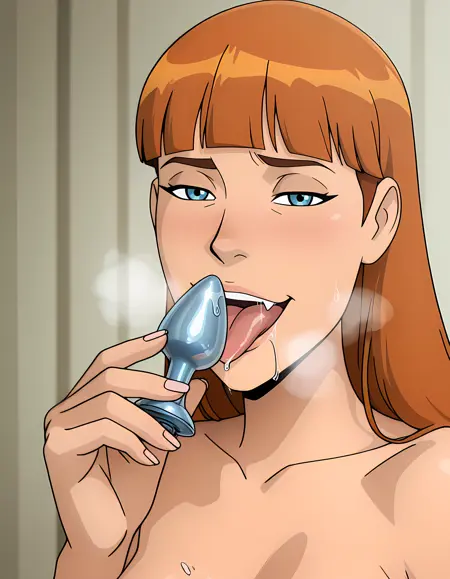 holding butt plug, open mouth, tongue out, saliva on butt plug, licking butt plug