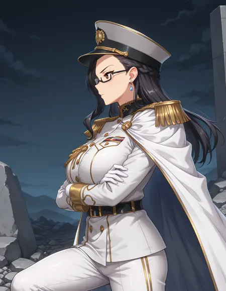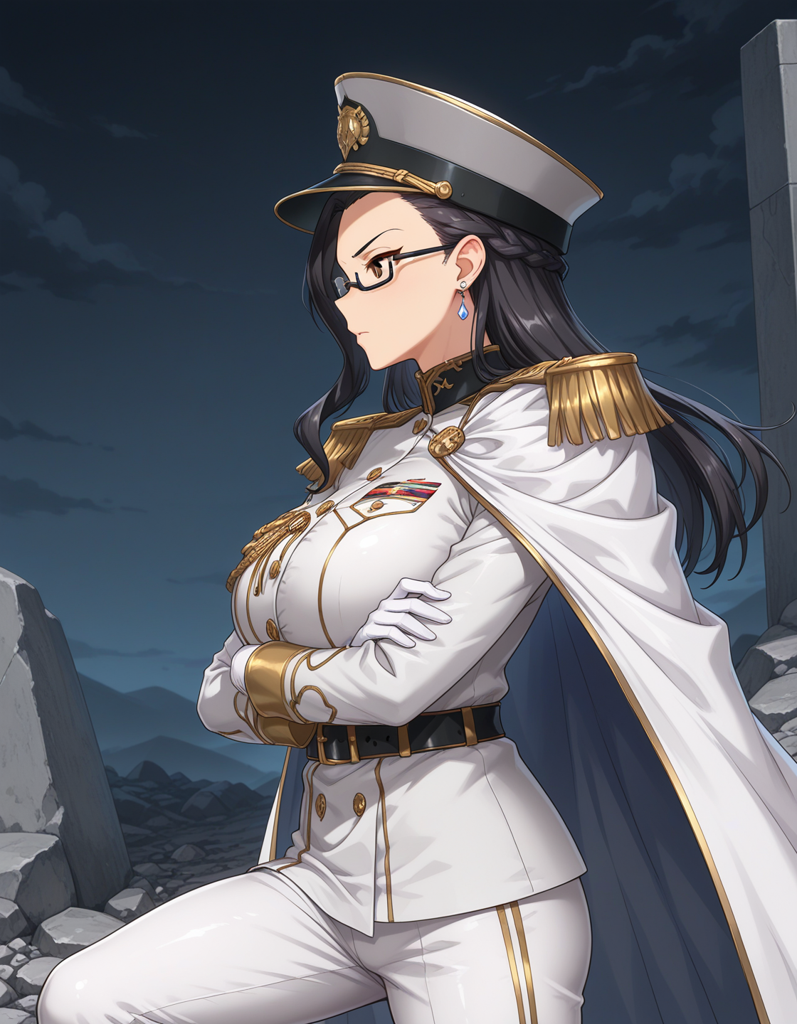 aejima misuzu, black hair, long hair, hair pulled back, braid, brown eyes, black glasses, under-rim eyewear, earrings, military uniform, military hat, white cape, epaulettes, aiguillette, white gloves, white pants, black belt