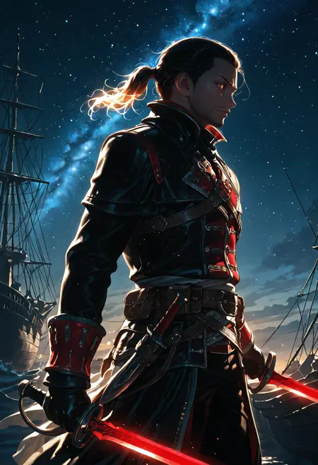 spcxl, 1boy, 眼部疤痕, 棕色眼睛, 黑发, 短发, 马尾, 红色发带, 头发向后梳, 胡渣, 面部毛发, 写实风格,