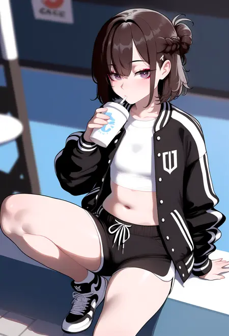 cost1, black jacket, varsity jacket, number print, white crop top, black shorts, sneakers, black and white, sporty, casual, streetwear,navel,