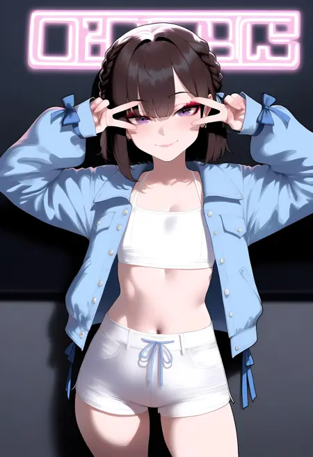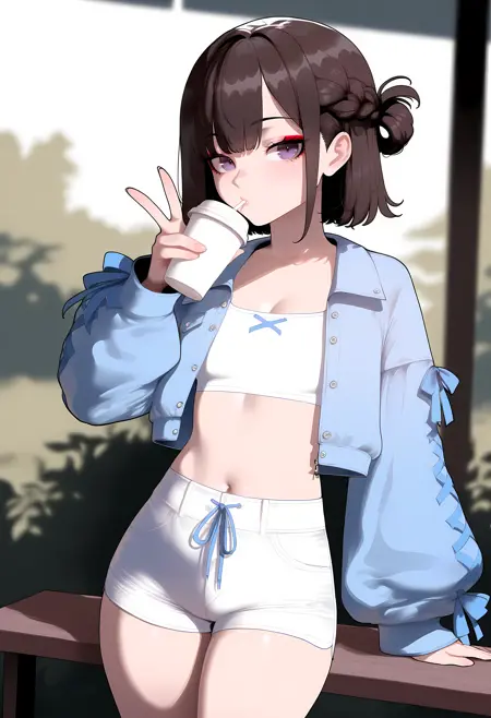 cost2, light blue jacket,ribbon sleeves, front view,white crop top, white short shorts with blue drawstring, casual sporty outfit,