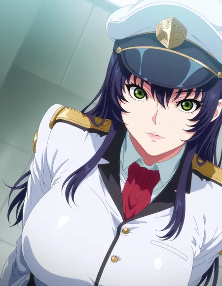 mai_kosss,mai_zegnae,mature_female,short_hair,brown_hair,purple_eyes,lips,large_breasts,glasses,peaked_cap,white_gloves,military_uniform,white_clothes,belt,pencil_skirt,pantyhose,black_knee_boots,yellow_stripes_boots