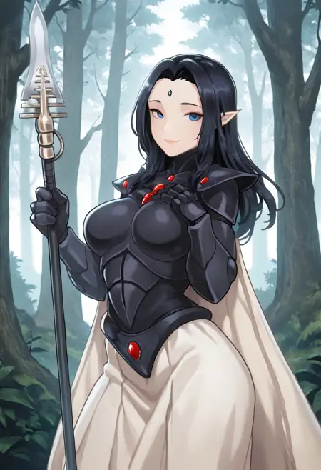 여성 엘프, 검은 머리, 긴 머리, 이마 보석, 파란 눈, 뾰족한 귀, 가슴