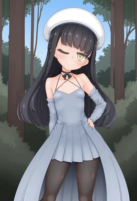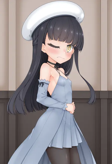 베레모, 흰색 머리장식, 목 끈, 검은 칼라, 파란 드레스, 검은 끈, 할터넥, 주름 드레스, 하이-로우 스커트, 파란 소매, 분리형 소매, 검은 팬티스타킹,