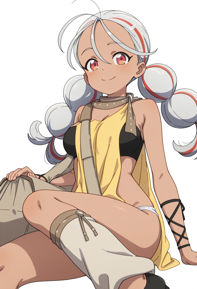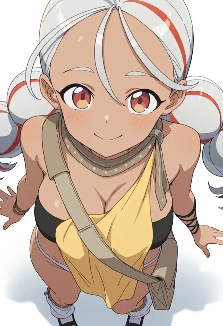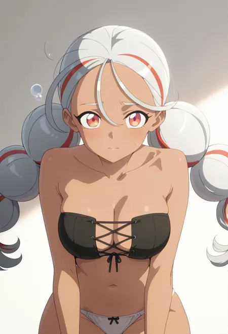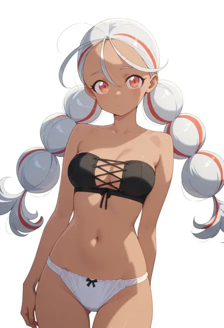 FEATURES: brown skin, reddish-orange eyes, multicolored hair, twin bubble ponytails, silver hair with red streaks