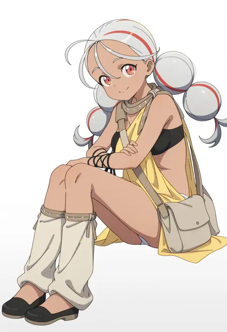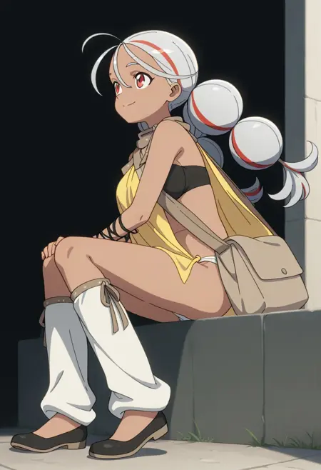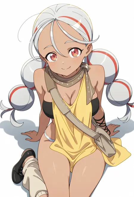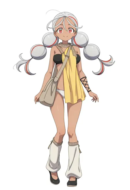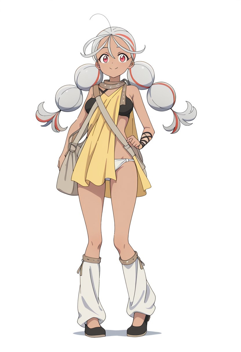 OUTFIT: , scarf, scarf-connected yellow fabric, arm-tied cloth, shoulder bag, black lace-up bra, white panties, black arm wraps, leg warmers, black slip on shoes