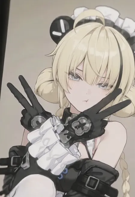 触发词:ailin,1girl,blonde hair,dress,long hair,gloves,blue eyes,black gloves,maid headdress,ahoge,thighhighs,black hair,lock,multicolored hair,braid,long hair,double bun,hair bun,detached sleeves,very long hair,streaked hair,twin braids,maid,black dress,mechanical arms,frills,bow,bare shoulders,