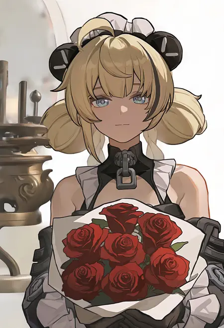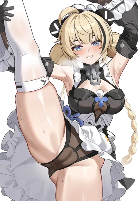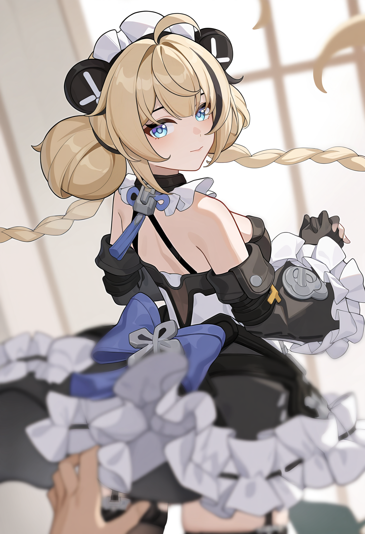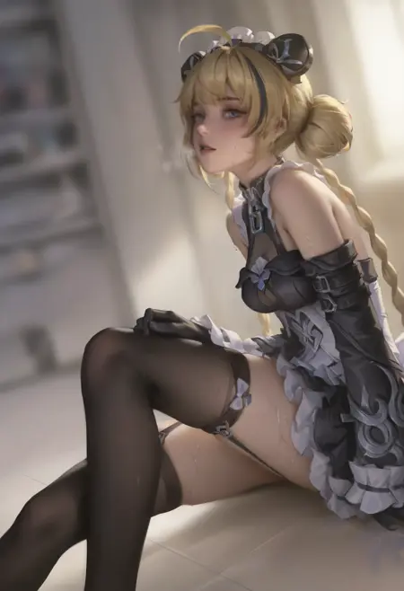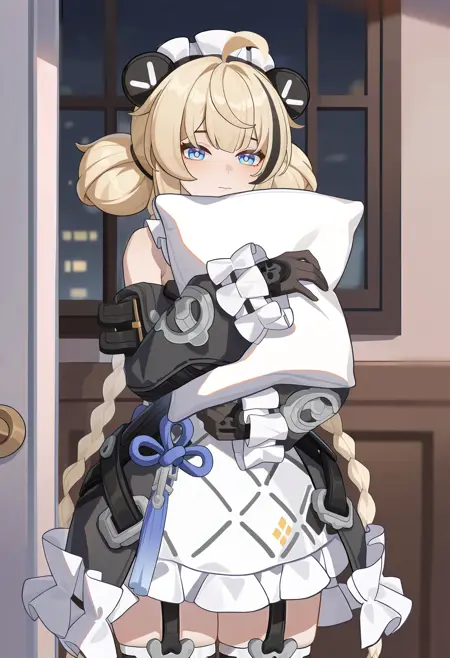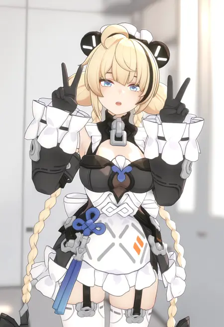 Trigger Word: ailin,1girl,blonde hair,dress,long hair,gloves,blue eyes,black gloves,maid headdress,ahoge,thighhighs,black hair,lock,multicolored hair,braid,long hair,double bun,hair bun,detached sleeves,very long hair,streaked hair,twin braids,maid,black dress,mechanical arms,frills,bow,bare shoulders,