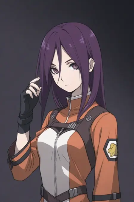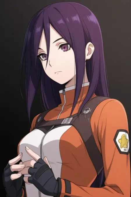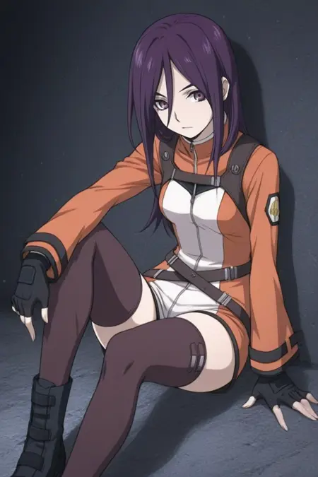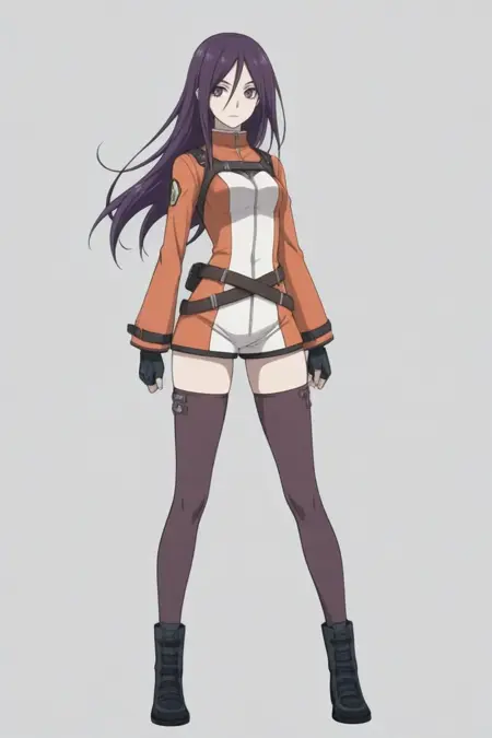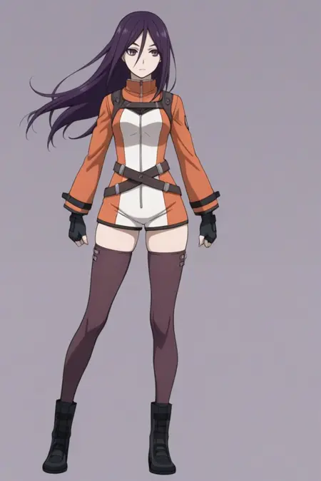 natsuki_kasuga,长发,紫色头发,发丝遮眼,紫色眼睛,身体紧身衣,露指手套,腰带,绝对领域,黑色过膝袜,靴子