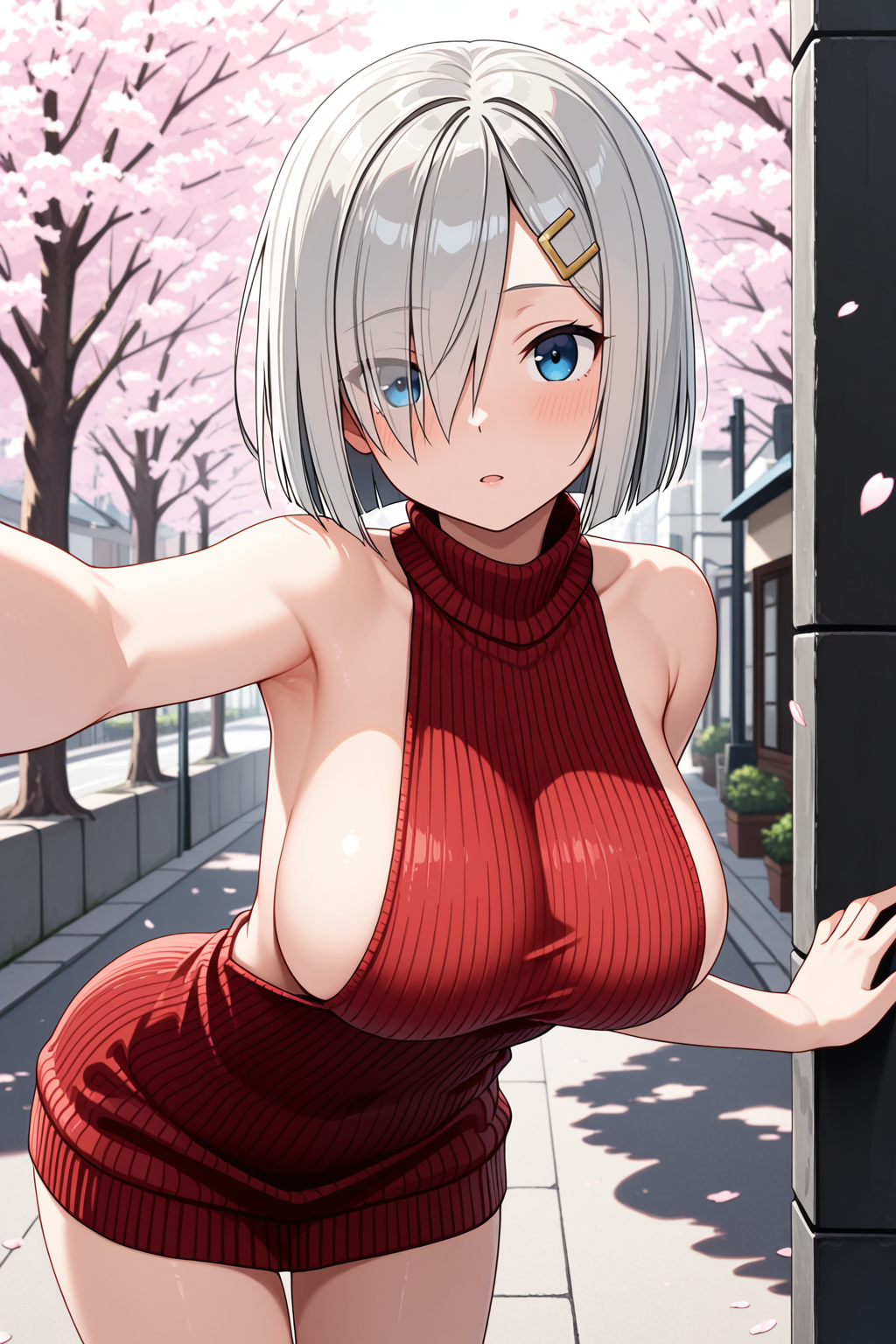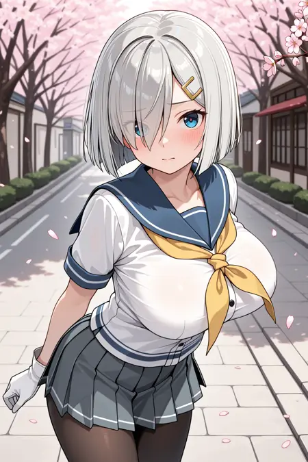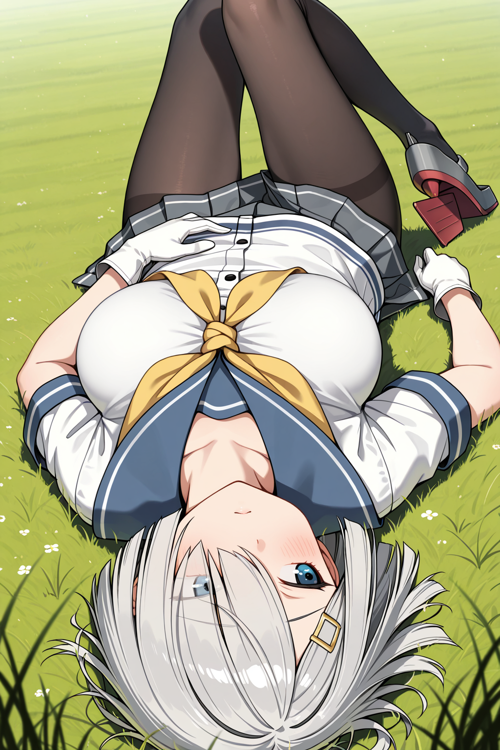 hamakaze (kancolle), blue eyes, grey hair, hair ornament, hair over one eye, hairclip, short hair