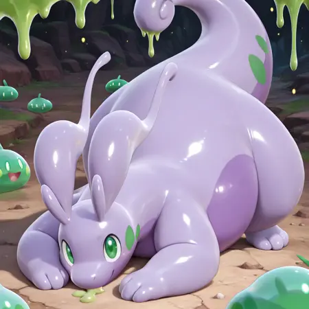 pokemon, dragon, purple skin, green eyes, fat, green slime, dripping, green spots