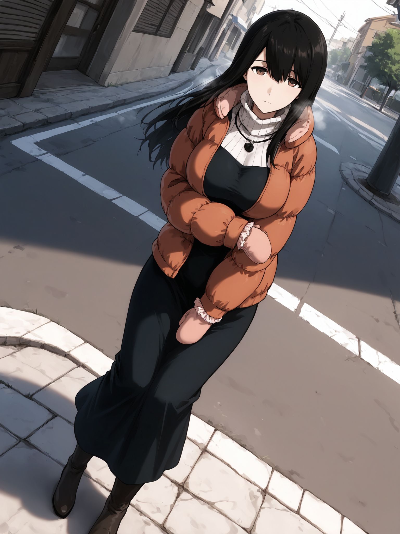 jacket,ribbed sweater,turtleneck,black dress,long sleeves,necklace,long skirt,boots,