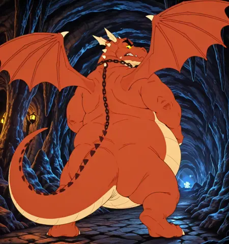 DragonLord, mature male, scalie, dragon, western dragon, red scales, yellow belly, thick eyebrows, black eyebrows, black eyes, yellow sclera, purple wings, fat, chain neckclace