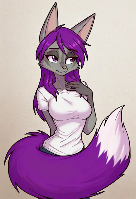 miri_rodgers, furry, 1girl, fox girl, animal ears, animal nose, purple hair, long hair, solo, purple eyes, tail, bangs, body fur, breasts, two-tone fur, fox ears, fox tail, snout,