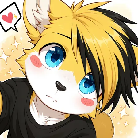 rajak_(rajak), furry, furry male, animal nose, animal ears, 1boy, tail, blue eyes, blonde hair, male focus, solo, body fur, snout, two-tone fur, yellow fur, short hair, white fur, multicolored hair, two-tone hair,