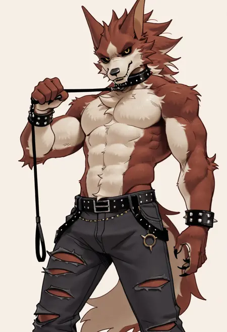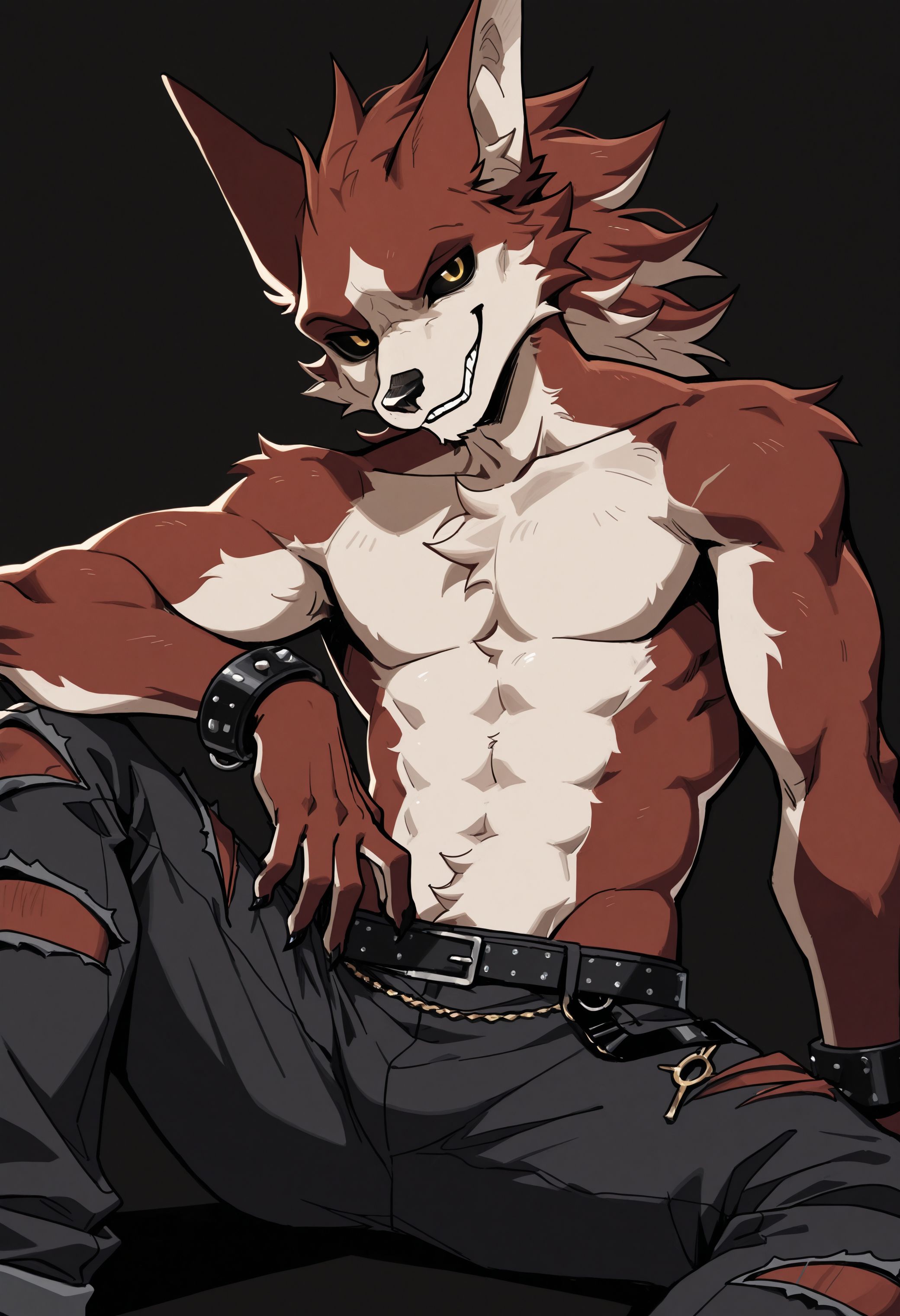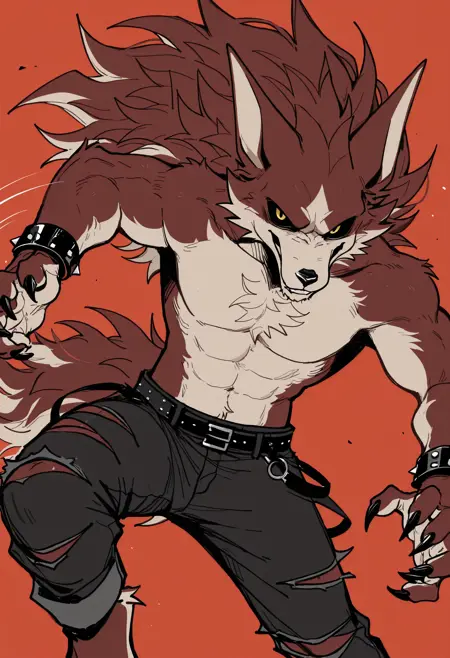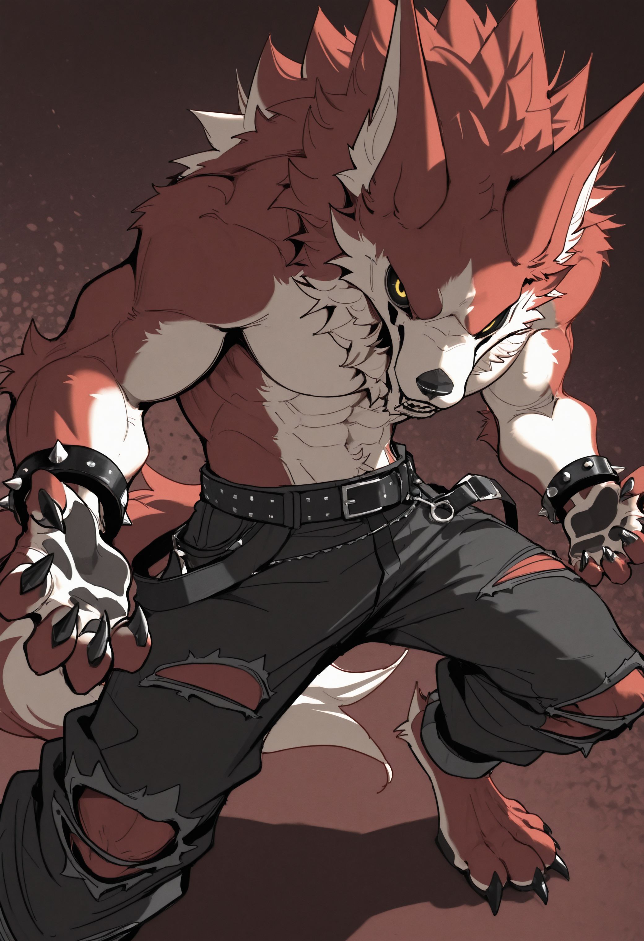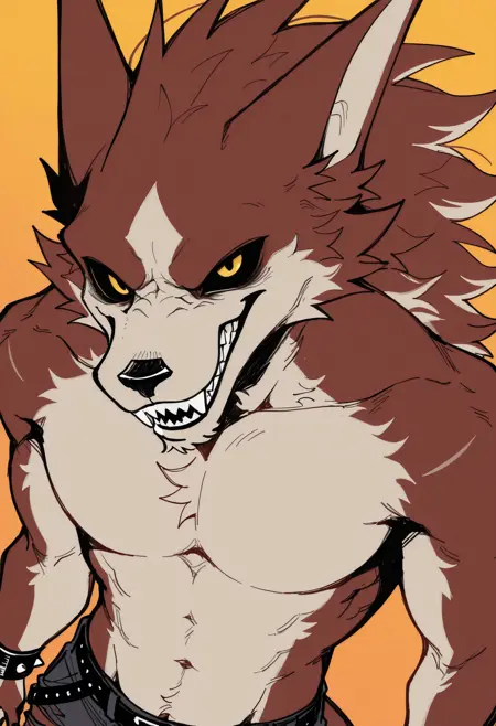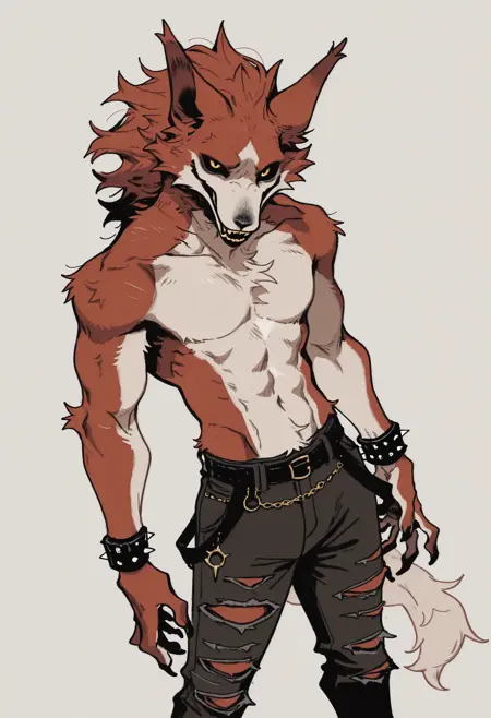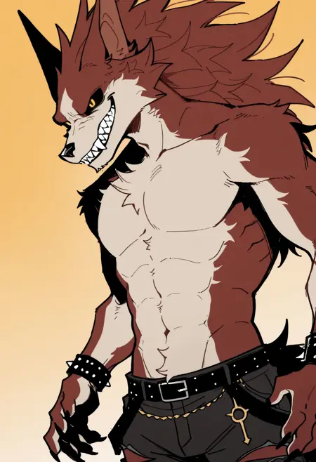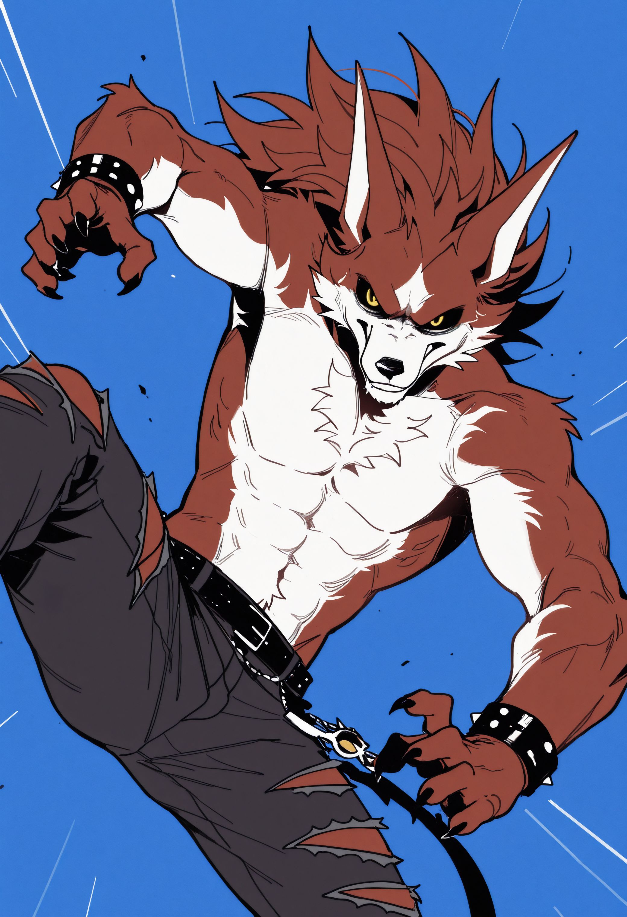 Illustrious: best quality, amazing quality, very aesthetic, absurdres, newest, lyc4n_w35t, fortnite, furry, furry male, 1boy, solo, black sclera, yellow eyes, muscular, belt, spiked bracelet, claws, torn pants, flat colors, looking at viewer, pectorals, ...your tags...