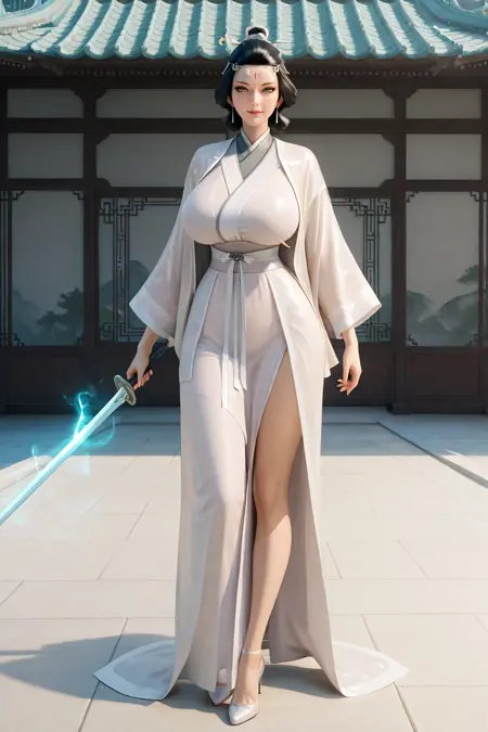 shuiyue, grey eyes, black hair, forehead mark, hair bun, white hair ornament, hair stick, earrings, jewelry, chinese clothes, hanfu