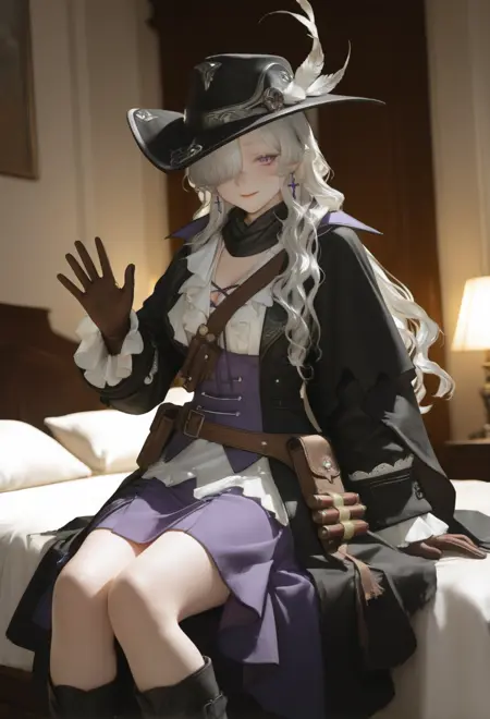 windsongpf, 1girl, solo, white hair, long hair, wavy hair, hair over one eye, gradient eyes, mole under mouth, breasts, cleavage, black coat, torn coat, two-sided fabric, purple corset, frills, scarf, black scarf, ascot, black cape, purple dress, brown gloves, brown belt, bandolier, cross-laced clothes, black headwear, hat feather, jewelry, earrings, black footwear, boots, brown bag