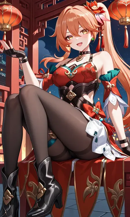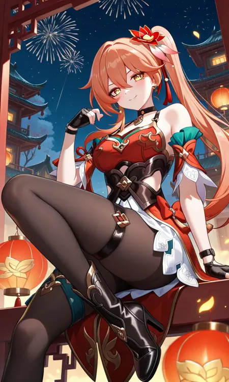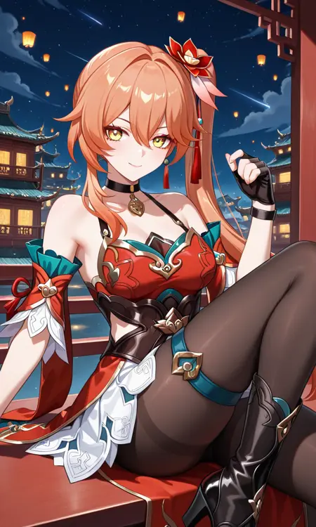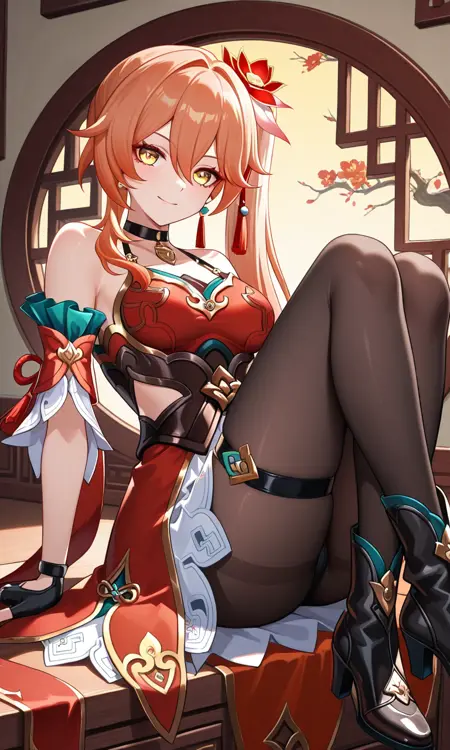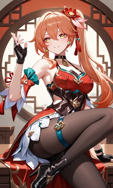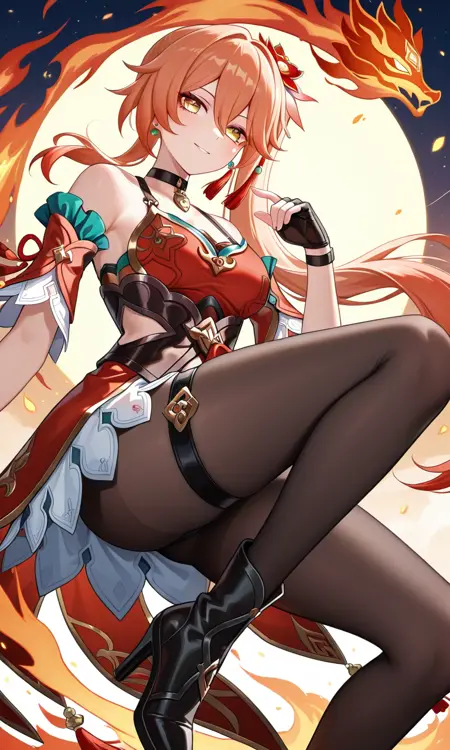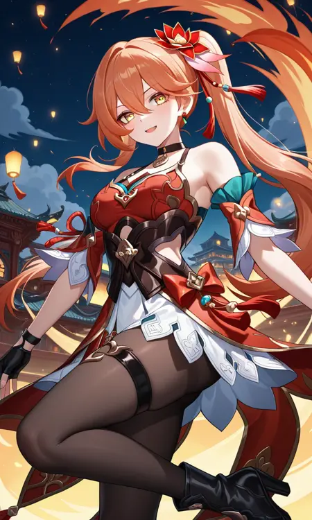 グイネイフェン(Honkai: Star Rail)、長い髪、黄色い目、オレンジ色の髪、サイドポニーテール、前髪、目の間の髪、イヤリング、黒いチョーカー、髪飾り、中くらいの胸、太もも、中国風の服、肩出し、ドレス、赤いドレス、ノースリーブ、取り外し可能な袖、指なし手袋、黒い手袋、白いスカート、黒いタイツ、太ももストラップ、ブーツ、ハイヒール、黒い靴