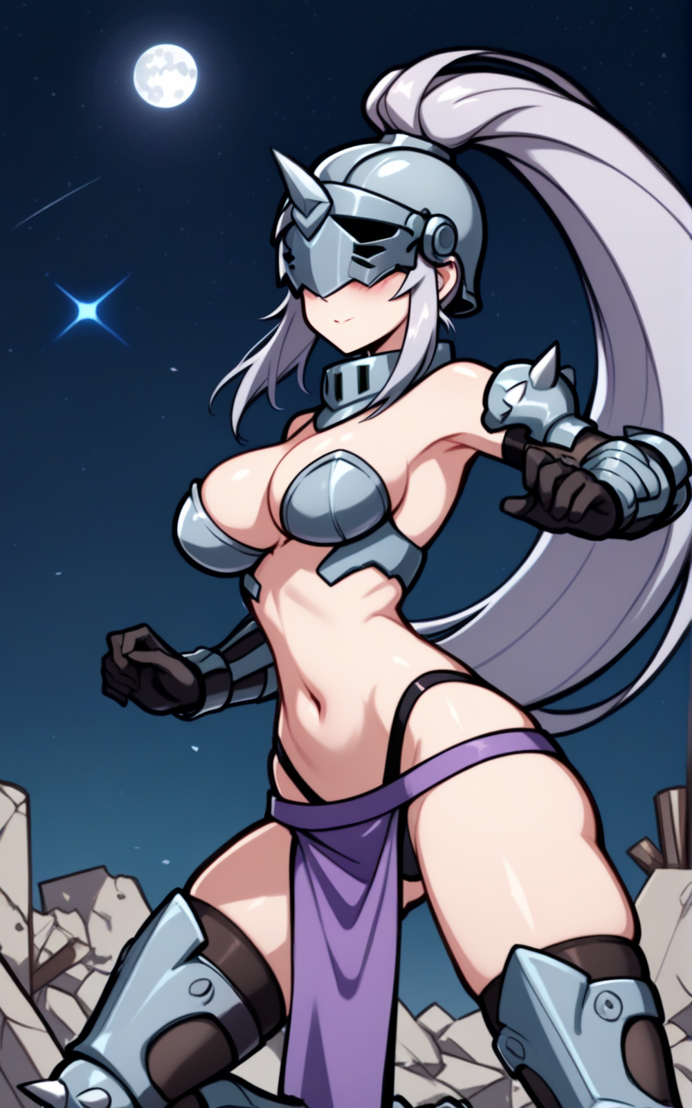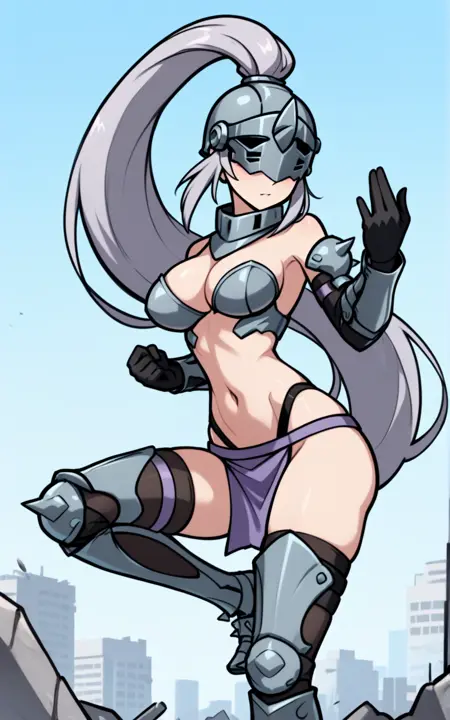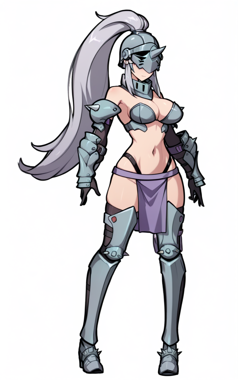 Reinforcement Tags: long hair, very long hair, grey hair, ponytail, high ponytail, covered eyesFor her Outfit:** armored boots, boots, greaves, thighhighs, thigh strap, pelvic curtain, purple pelvic curtain, underwear, panties, highleg, highleg panties, armor, grey armor, bikini armor, gloves, gauntlets, elbow gloves, black gloves, mask, spikes, helmet, visor (armor), bare shoulders, cleavage