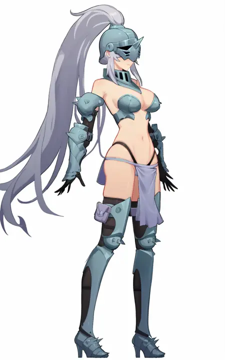 Reinforcement Tags: long hair, very long hair, grey hair, ponytail, high ponytail, covered eyesFor her Outfit:** armored boots, boots, greaves, thighhighs, thigh strap, pelvic curtain, purple pelvic curtain, underwear, panties, highleg, highleg panties, armor, grey armor, bikini armor, gloves, gauntlets, elbow gloves, black gloves, mask, spikes, helmet, visor (armor), bare shoulders, cleavage
