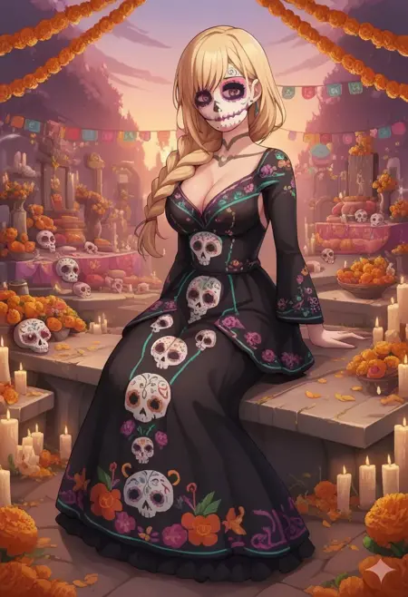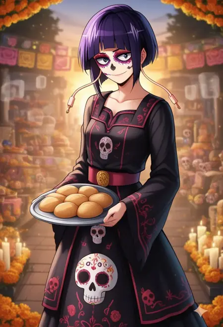 <lora:Day_of_the_Dead_V:1>,day of the dead,face paint,skull makeup in white,