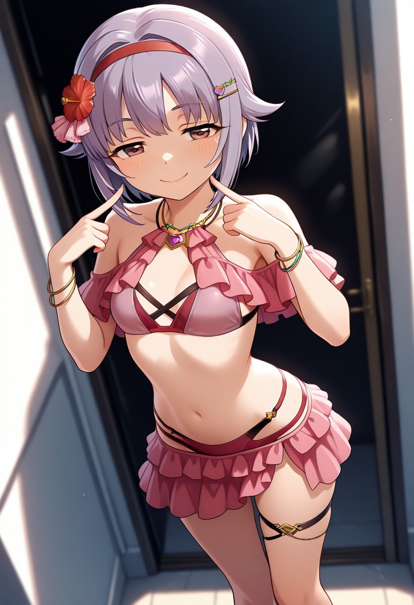 short hair,purple hair,brown eyes,hair clip,small breasts,